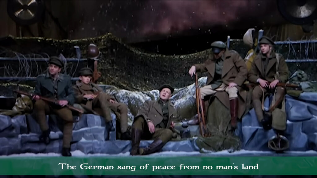 The lyrics tell how they heard a German soldier singing a song of peace from no man’s land on Christmas day.
